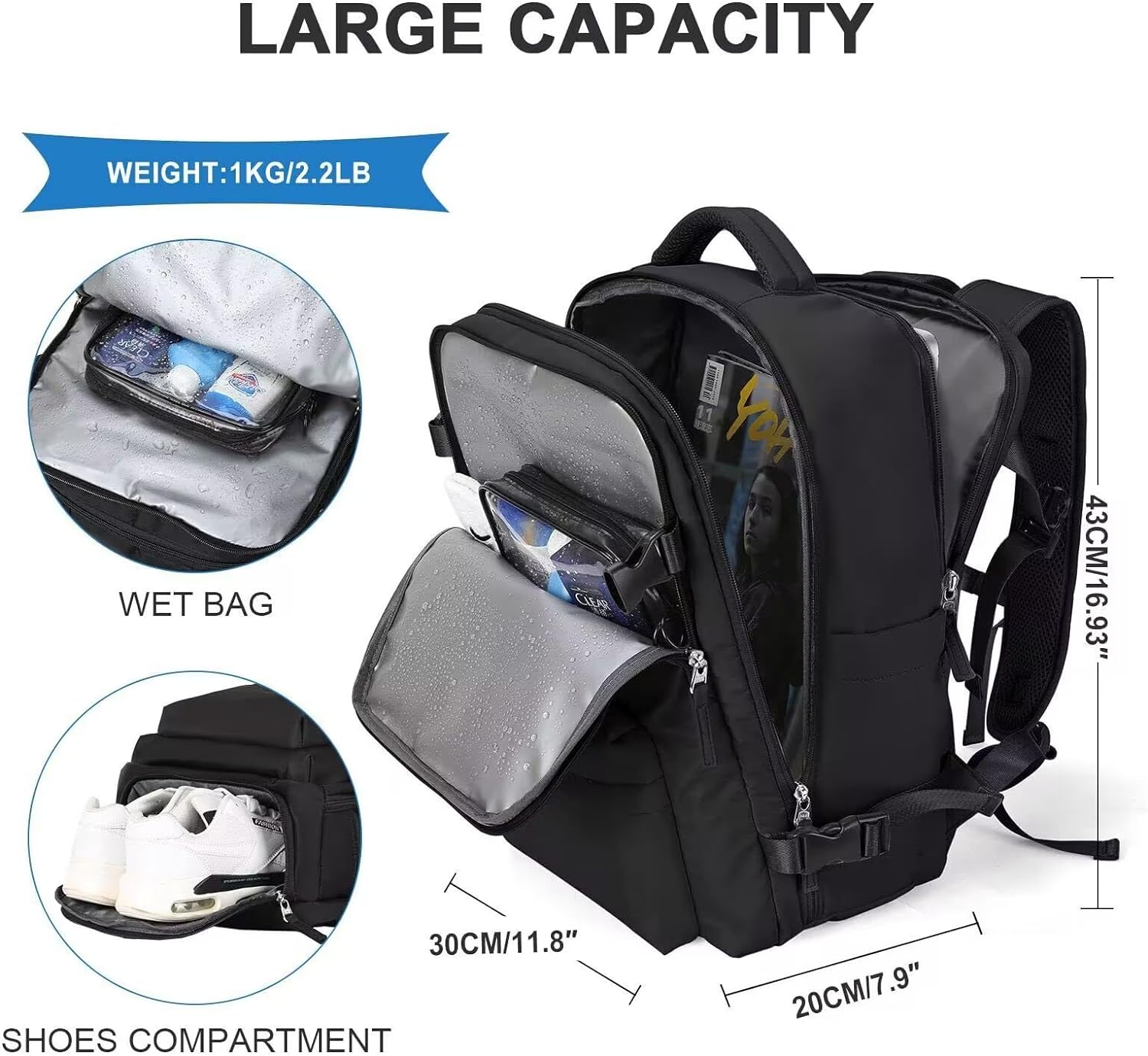 [Separate shoe compartment and wet bag] A shoe compartment at the bottom of the backpack stores shoes, keeping them separate and everything else clean. There are two ventilation holes in the shoe compartment to keep it breathable and odorless. The flight-approved waterproof travel backpack front waterproof bag features a high-density waterproof material that can help you separate dry items from wet items such as wet clothes or towels.