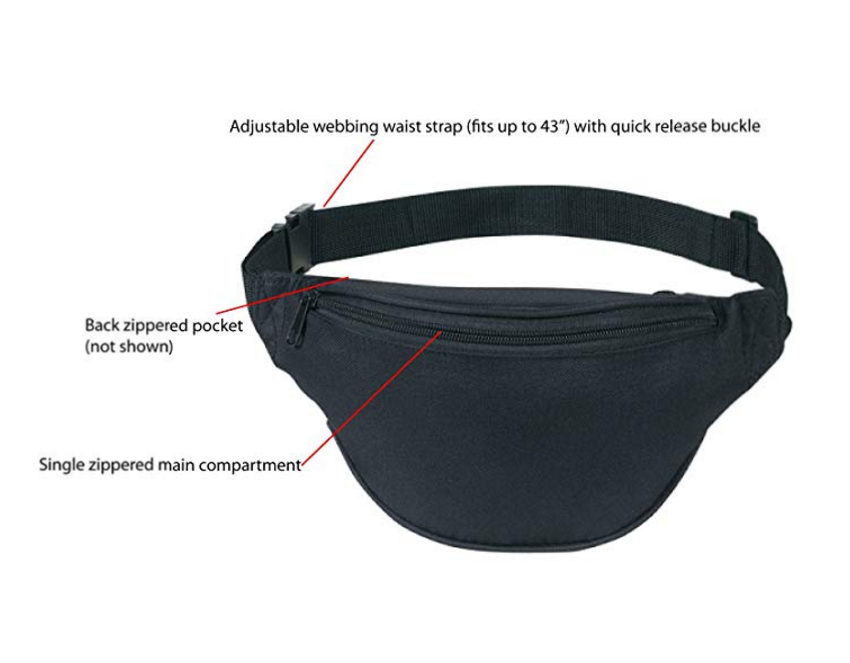 MODEL ITEM # H0009 Product Detail: 2-Zipper compartment fanny pack with Adjustable waist (fits up to 43”) and quick release buckle |