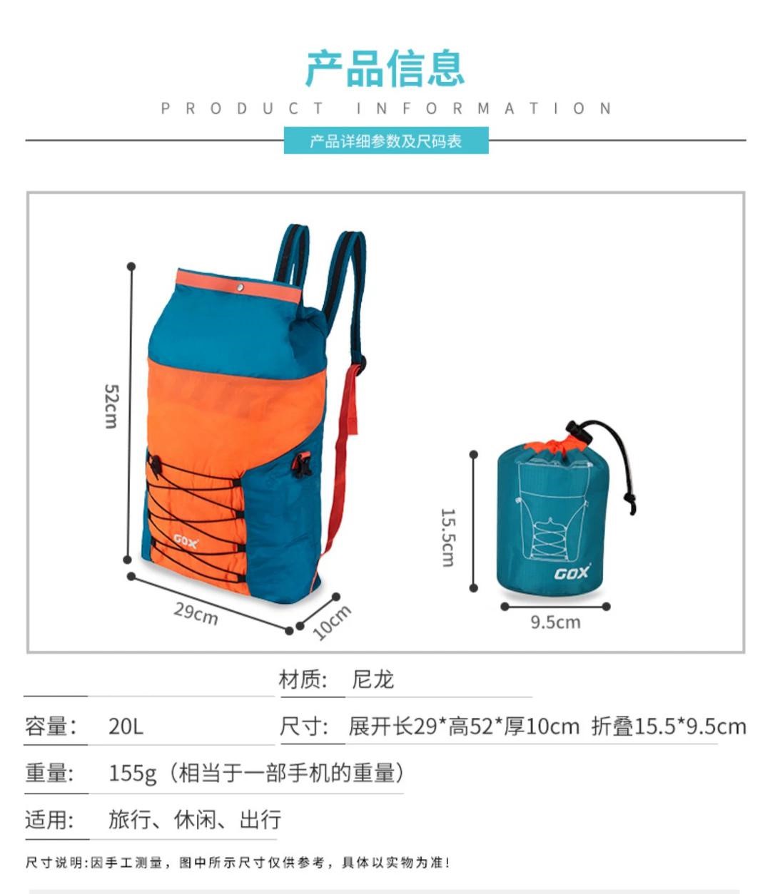 Model item # RB03-06 Product Detail: Size:Unfold length 29* height 52* thickness 10cm , fold 15.5*9.5cm Weight: 155g Material: Nylon Colour: As show Capacity:20L |