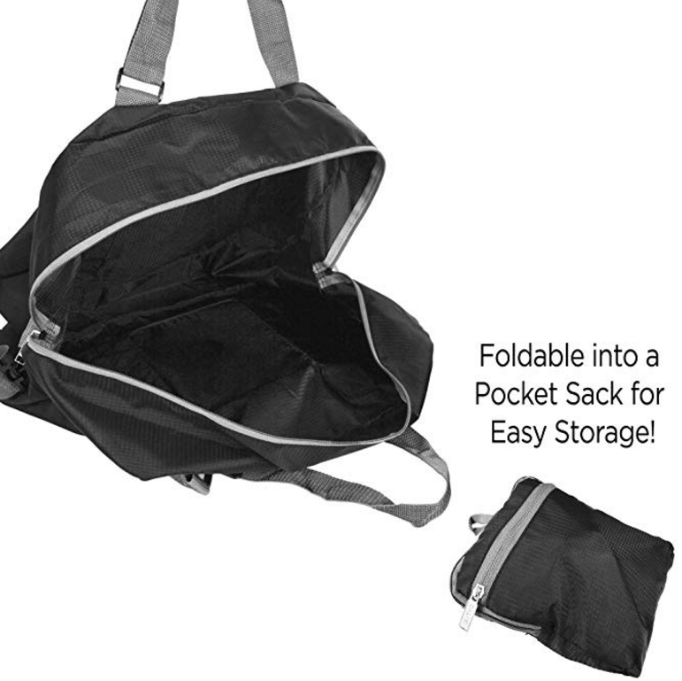 Foldable portable into the front pocket, shoulder strap for ease of use, adjustable hand straps for quick carry purposes, Front Zipper pocket for additional storage, rear velcro straps for luggage attachment.