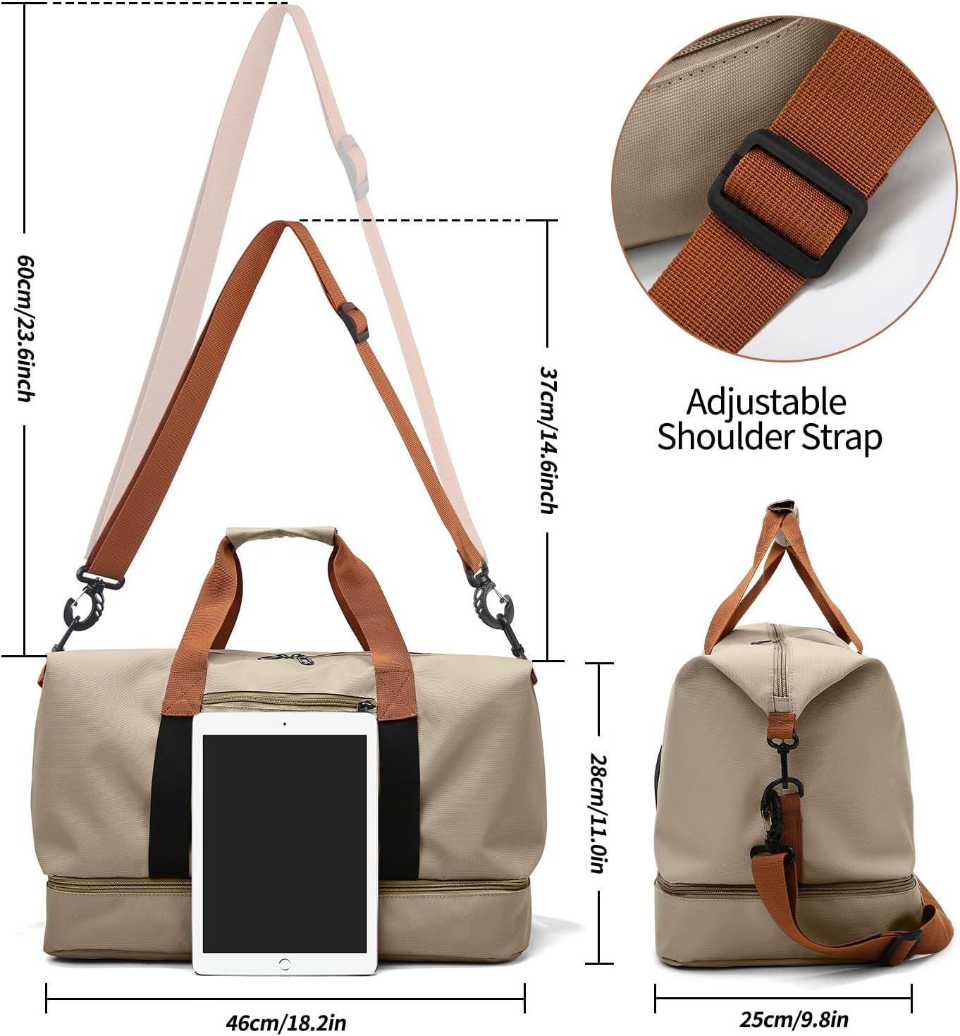 【Sturdy and Versatile】 Made with good quality nylon and canvas, water-resistant, tear-resistant, and easy to clean. With adjustable, detachable shoulder straps allow you to carry them in a variety of ways. 【Stay Organized】 Gym bag with 7 pockets, including a roomy main compartment, a shoe compartment, a wet pocket, 3 side pockets, and a front zipper pocket, you can easily store all your travel, sports, gym, and camping essentials. 【Dry Wet Separate Travel Bag】 Keep your wet and dry items separate. The waterproof PVC pocket is suitable for storing wet clothes, towels, toiletries, etc. 【Separate Shoe Compartment】 This carry on bag has a separate compartment on the bottom which is useful for keeping your shoes or dirty clothes separate from those clean items while travelling. 【Wide Application】 Back side sleeve allows you to slide it over the standard handle of a rolling suitcase or luggage for easy carry. Suitable for use as airplane friendly travel bag, school duffle bag, gym bag, weekend bag, carry-on bag, or overnight bag. |