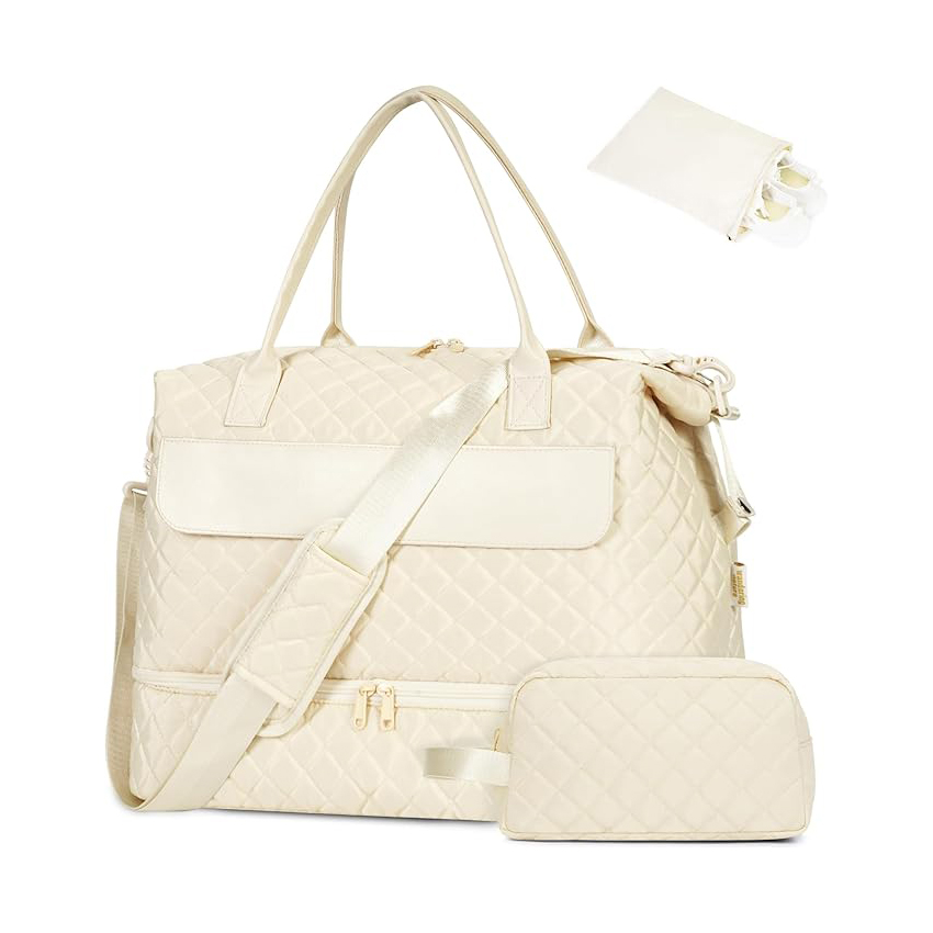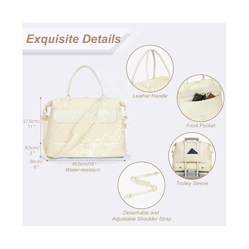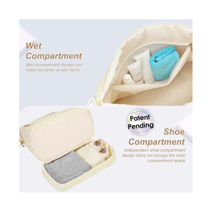 (1)This travel duffle bag has a wet and dry separation design to provide you with a better experience during travel. Tre is a waterproof PVC lined pocket to separate dry and wet items, making it ideal for holding a towel and toiletries. The carry on for airplanes has a double-layer design. The shoe compartment on the lower layer can accommodate a pair of shoes and laundry. For novice mothers, the bottom of the hospital bag is perfect for storing diapers, wipes